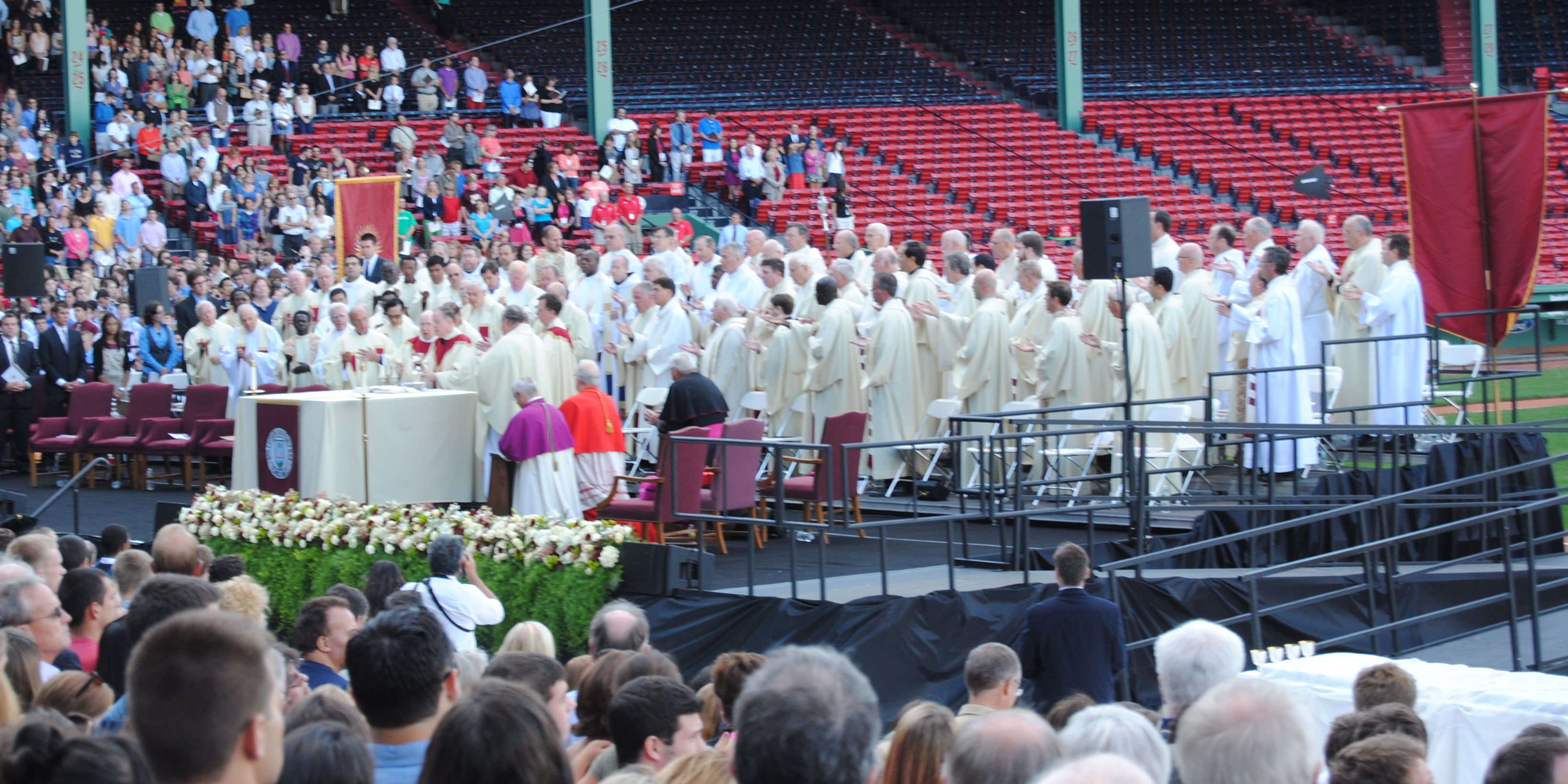 Walking through Fenway Park’s E Gate from Lansdowne Street, I am overwhelmed by the sight of priests, Catholic priests. A parade of Catholic priests, primarily Jesuits, each dressed in a white alb and stole. Some smile warmly. Some fidget with their iPhones. Others stare off into the distance. They are all preparing to concelebrate the Mass of the Holy Spirit in honor of the beginning of the academic year at Boston College and Boston College High School and the sesquicentennial celebration of the founding of these institutions.