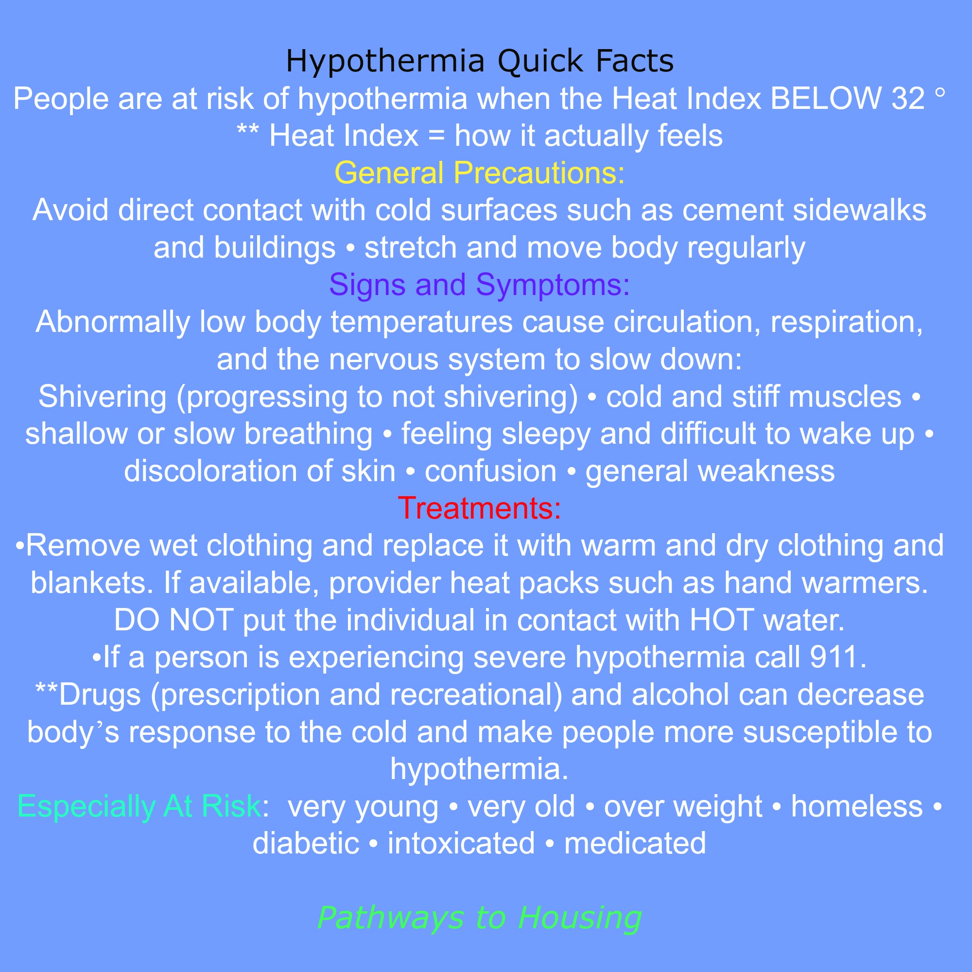 When the temperature reaches below 32 degrees, it is considered hypothermia weather and it is not safe for anyone to be outside for an extended period of time. Hypothermia season brings particular concern for homeless individuals, who often have few options but to stay out in the elements. If you are concerned about an individual during an extreme weather occurrence, please call your local Hypothermia/Shelter Hotline. (For instance, here is information for the DC area.) Depending on your area, hypothermia hotlines can lead to 24/7 services such as transportation to emergency shelters and the distribution of items such as blankets, gloves, and jackets.