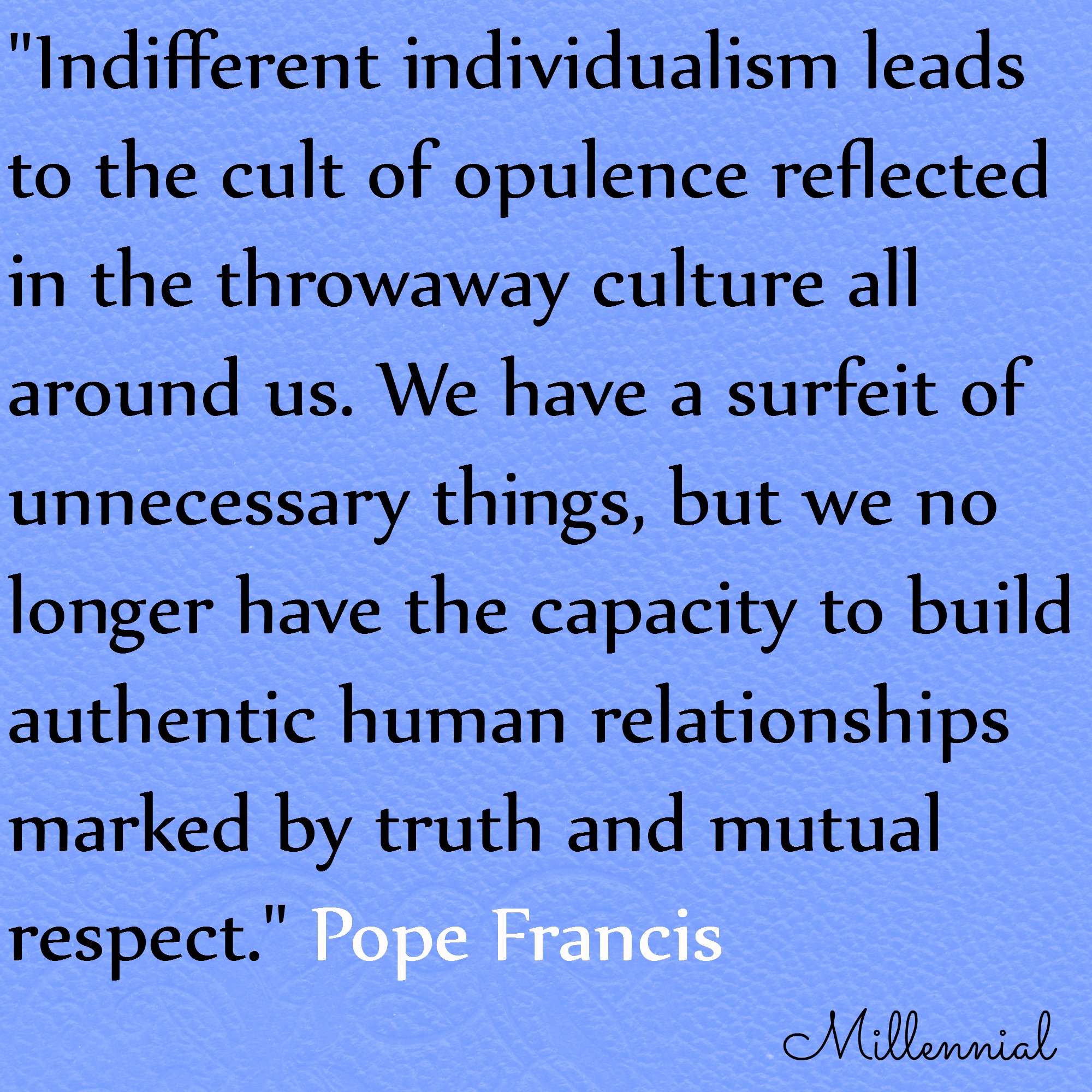 Pope Francis: “Indifferent individualism leads to the cult of opulence reflected in the throwaway culture all around us. We have a surfeit of unnecessary things, but we no longer have the capacity to build authentic human relationships marked by truth and mutual respect.”