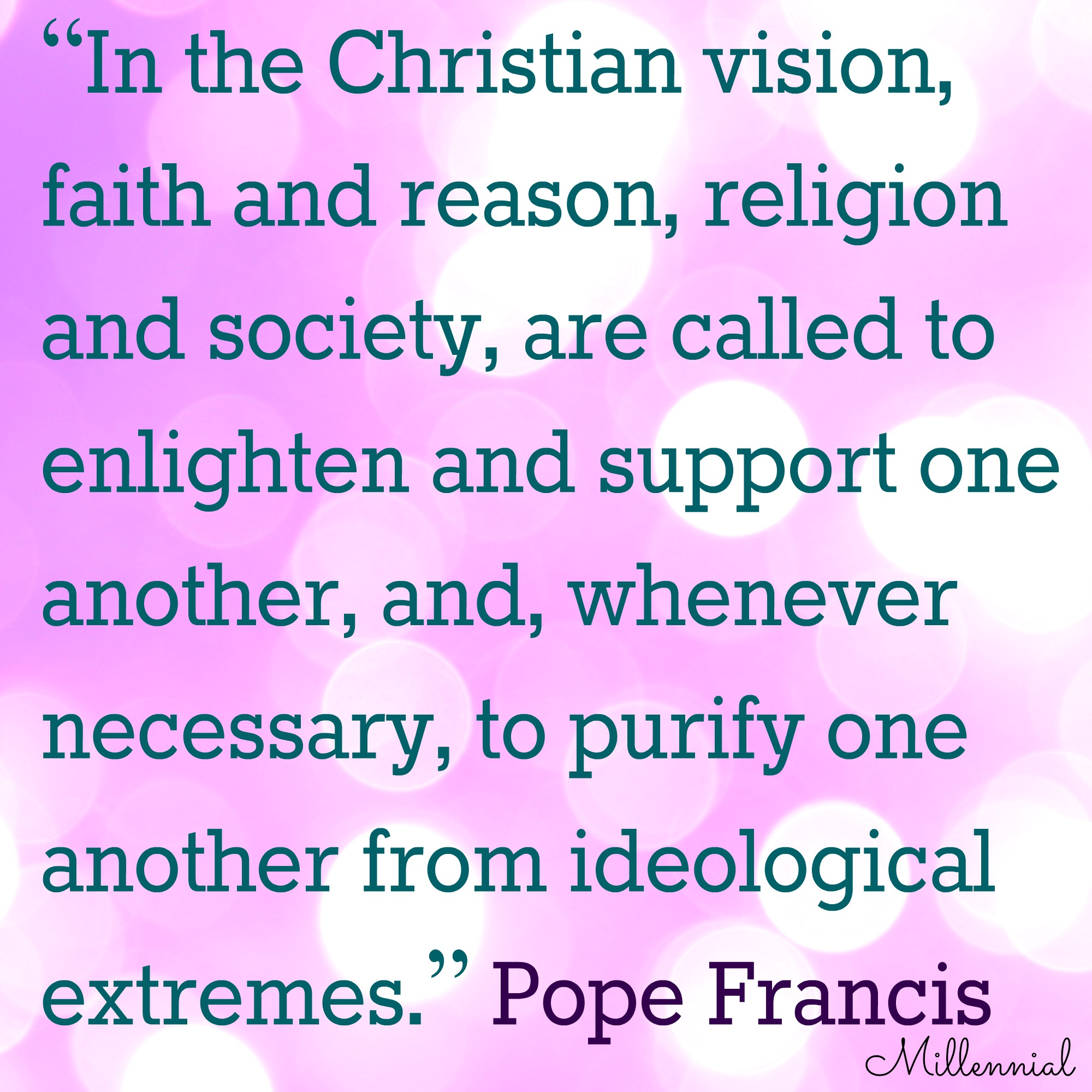 Pope Francis: “In the Christian vision, faith and reason, religion and society, are called to enlighten and support one another, and, whenever necessary, to purify one another from ideological extremes.”