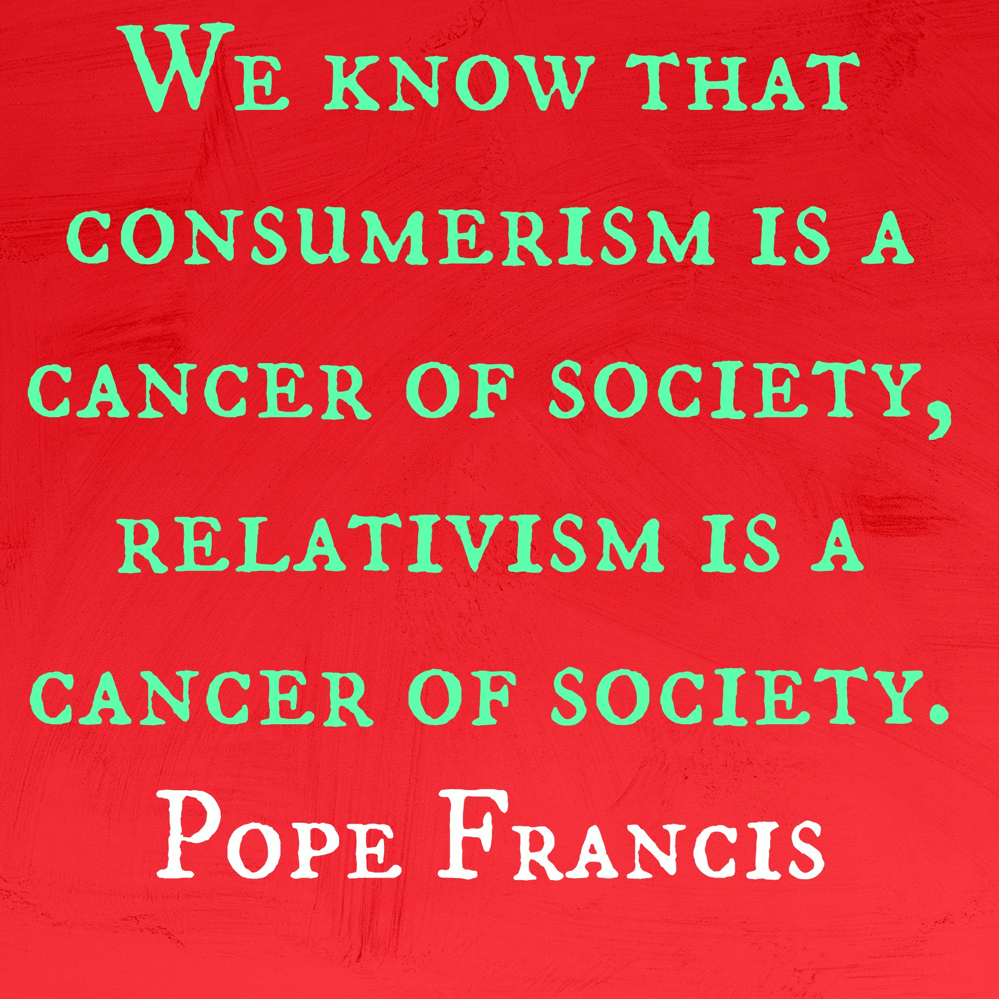 Pope Francis: “We know that consumerism is a cancer of society, relativism is a cancer of society, and I speak about this in the next encyclical that will be issued this month.”