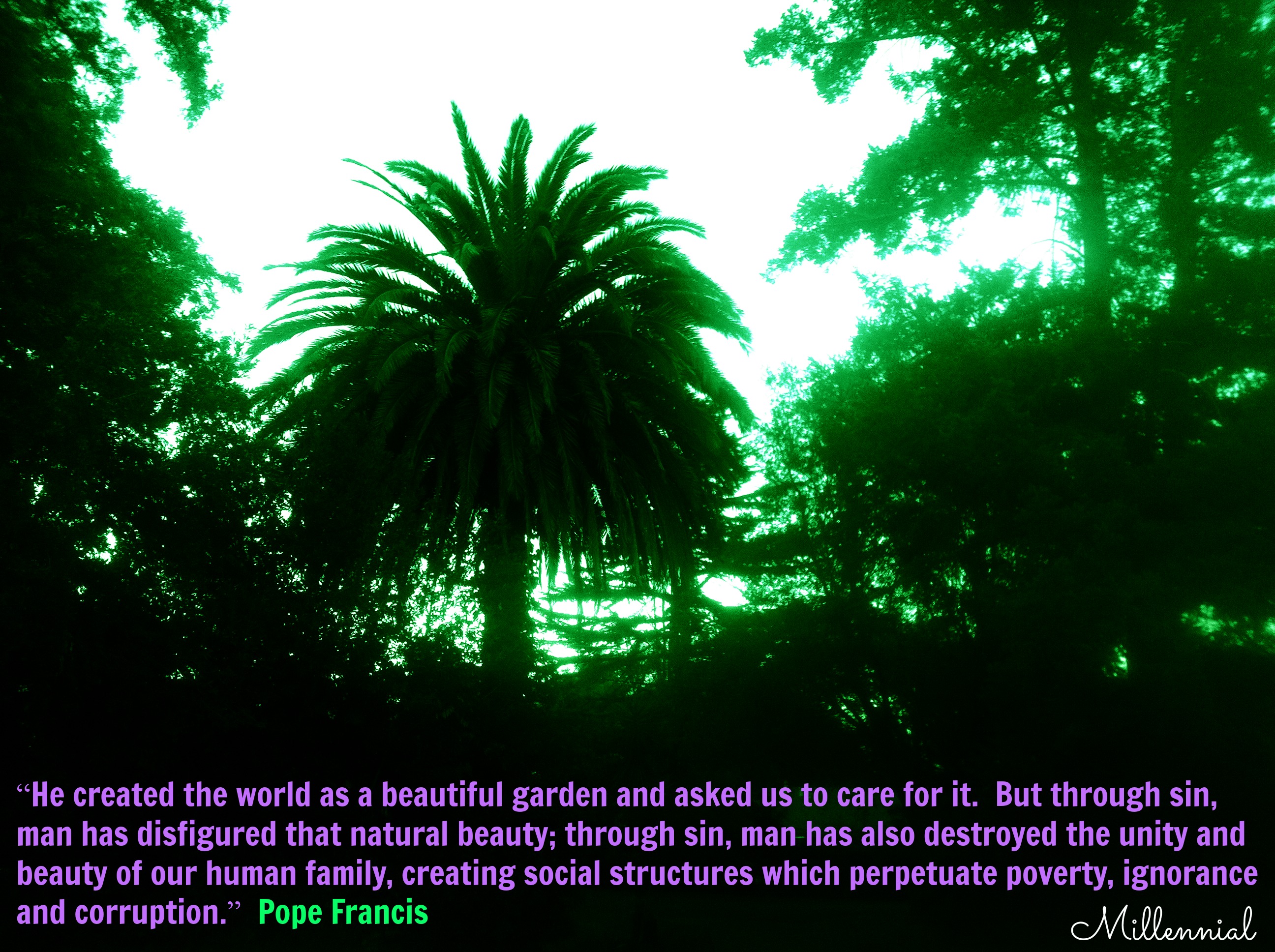 Pope Francis: “He created the world as a beautiful garden and asked us to care for it. But through sin, man has disfigured that natural beauty; through sin, man has also destroyed the unity and beauty of our human family, creating social structures which perpetuate poverty, ignorance, and corruption.”