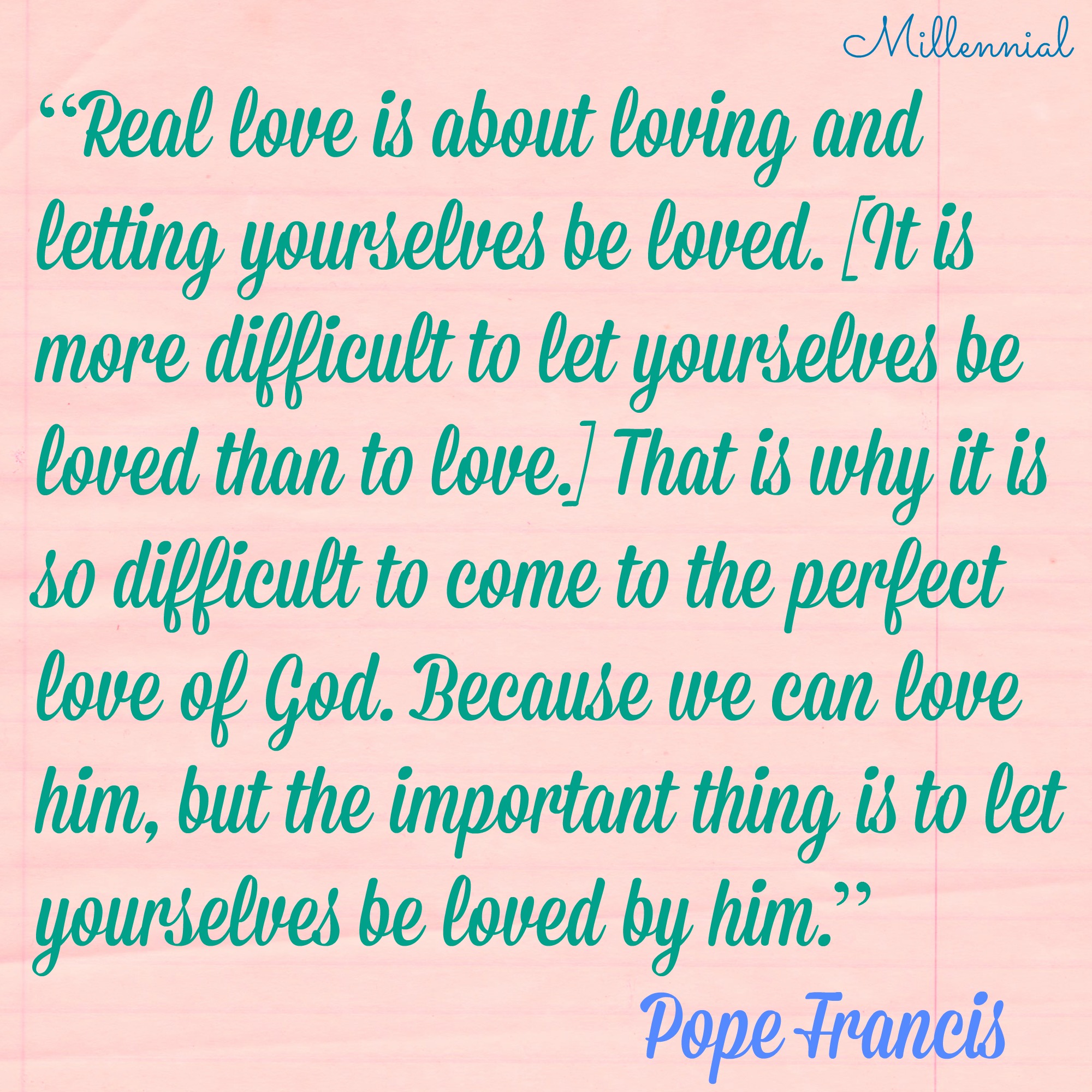 Pope Francis: “Real love is about loving and letting yourselves be loved. [It is more difficult to let yourselves be loved than to love.] That is why it is so difficult to come to the perfect love of God. Because we can love him, but the important thing is to let yourselves be loved by him.”
