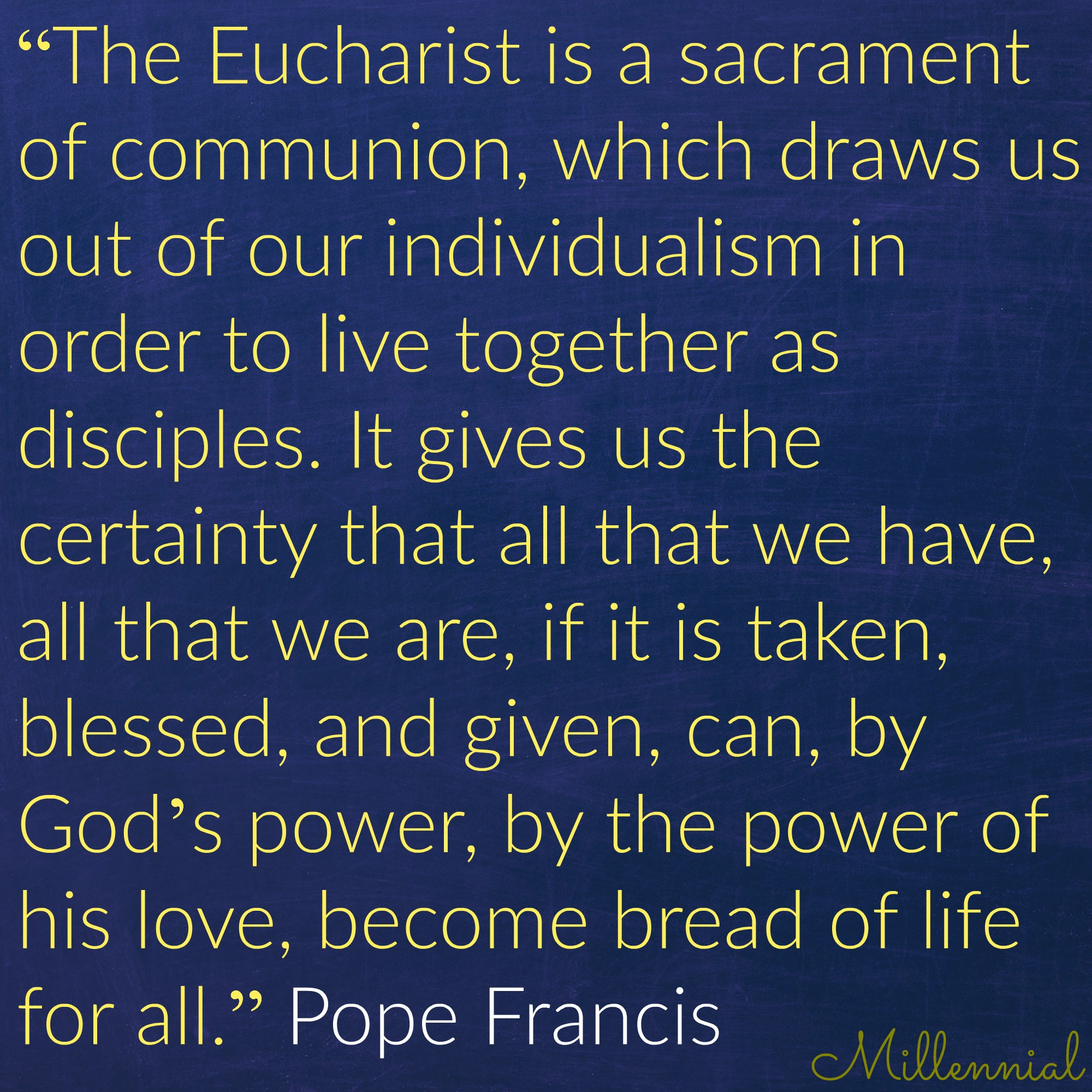 Pope Francis: “The Eucharist is a sacrament of communion, which draws us out of our individualism in order to live together as disciples. It gives us the certainty that all that we have, all that we are, if it is taken, blessed, and given, can, by God’s power, by the power of his love, become bread of life for all.”