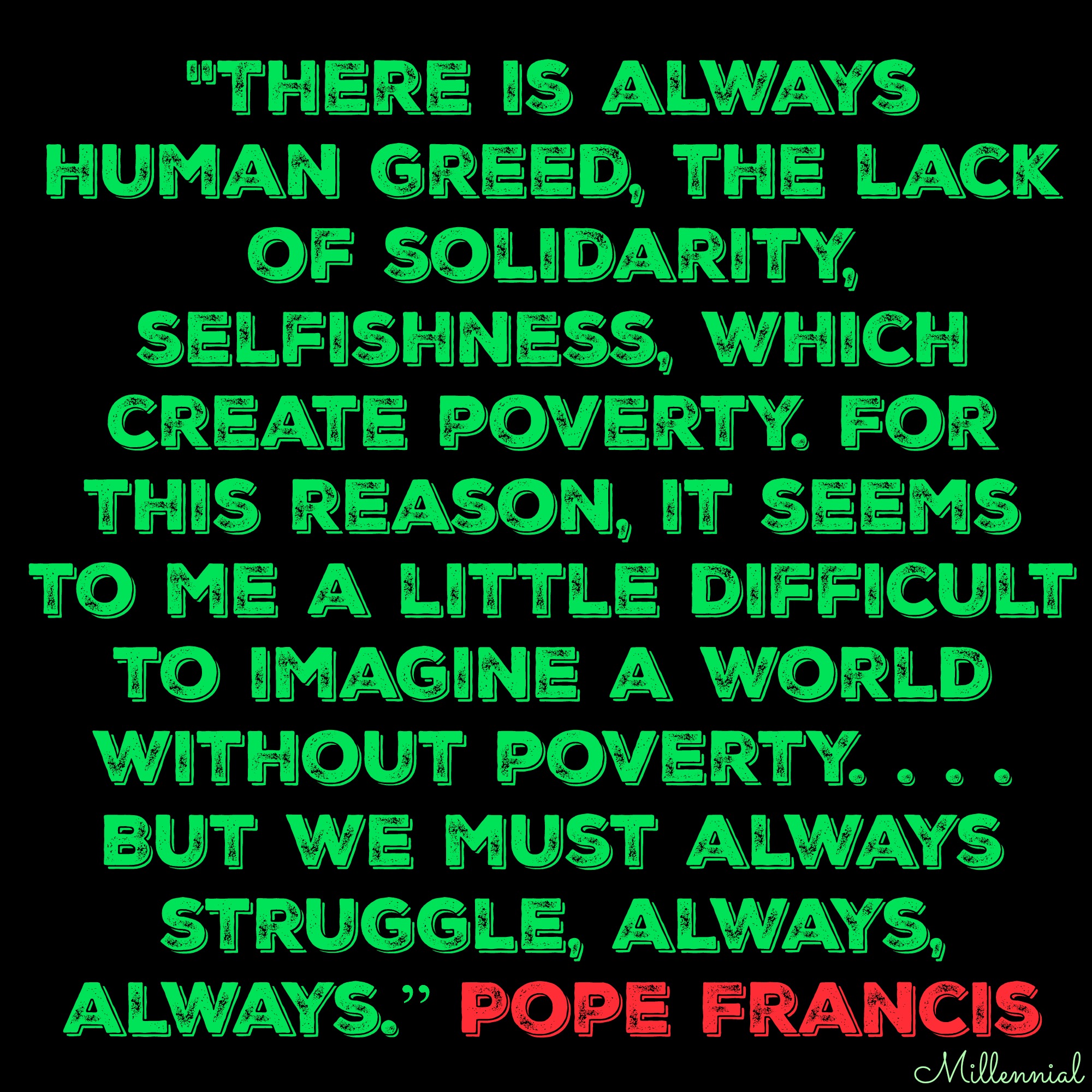 Pope Francis: “There is always human greed, the lack of solidarity, selfishness, which create poverty. For this reason, it seems to me a little difficult to imagine a world without poverty. . . . But we must always struggle, always, always.”