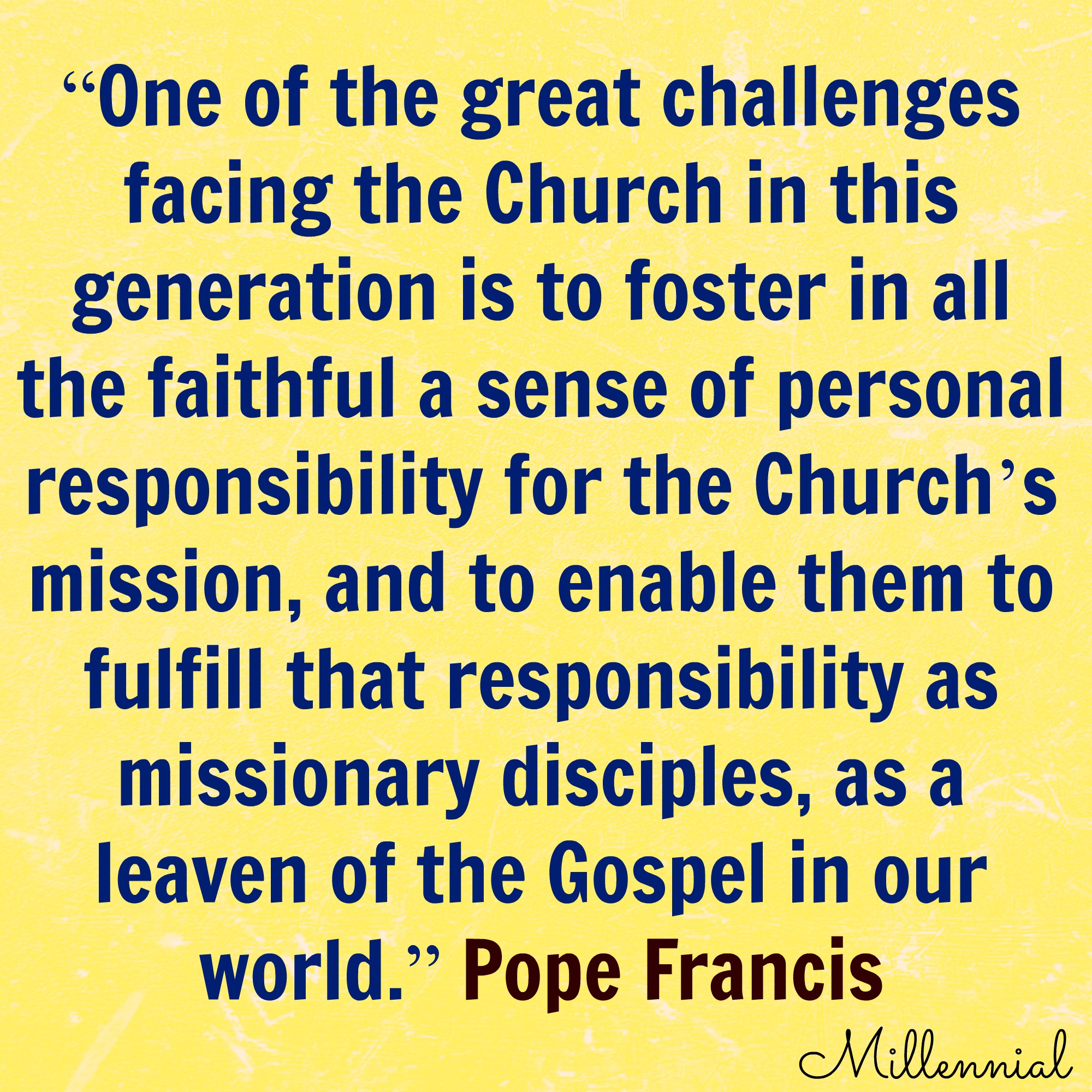 Pope Francis: “One of the great challenges facing the church in this generation is to foster in all the faithful a sense of personal responsibility for the Church’s mission, and to enable them to fulfill that responsibility as missionary disciples, as a leaven of the Gospel in our world.”
