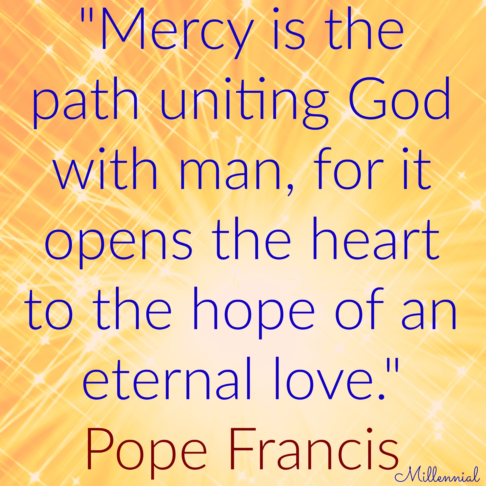 Quote of the Day Pope Francis: “Mercy is the path uniting God with man, for it opens the heart to the hope of an eternal love.” Share this: Click to share on Facebook (Opens in new window) Facebook Click to share on LinkedIn (Opens in new window) LinkedIn Click to share on Threads (Opens in new window) Threads Click to share on Reddit (Opens in new window) Reddit Click to share on Tumblr (Opens in new window) Tumblr Click to share on X (Opens in new window) X Click to share on Bluesky (Opens in new window) Bluesky Click to share on Pinterest (Opens in new window) Pinterest Click to email a link to a friend (Opens in new window) Email Click to print (Opens in new window) Print Like Loading... Related