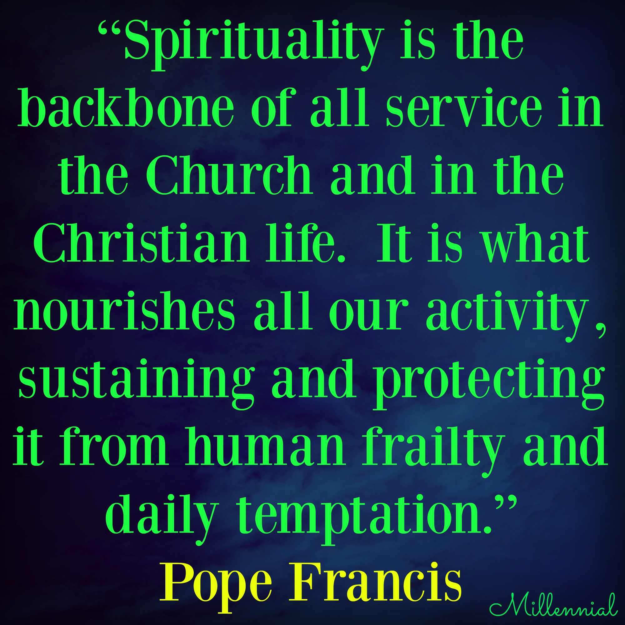 Pope Francis: “Spirituality is the backbone of all service in the Church and in the Christian life. It is what nourishes all our activity, sustaining and protecting it from human frailty and daily temptation.”
