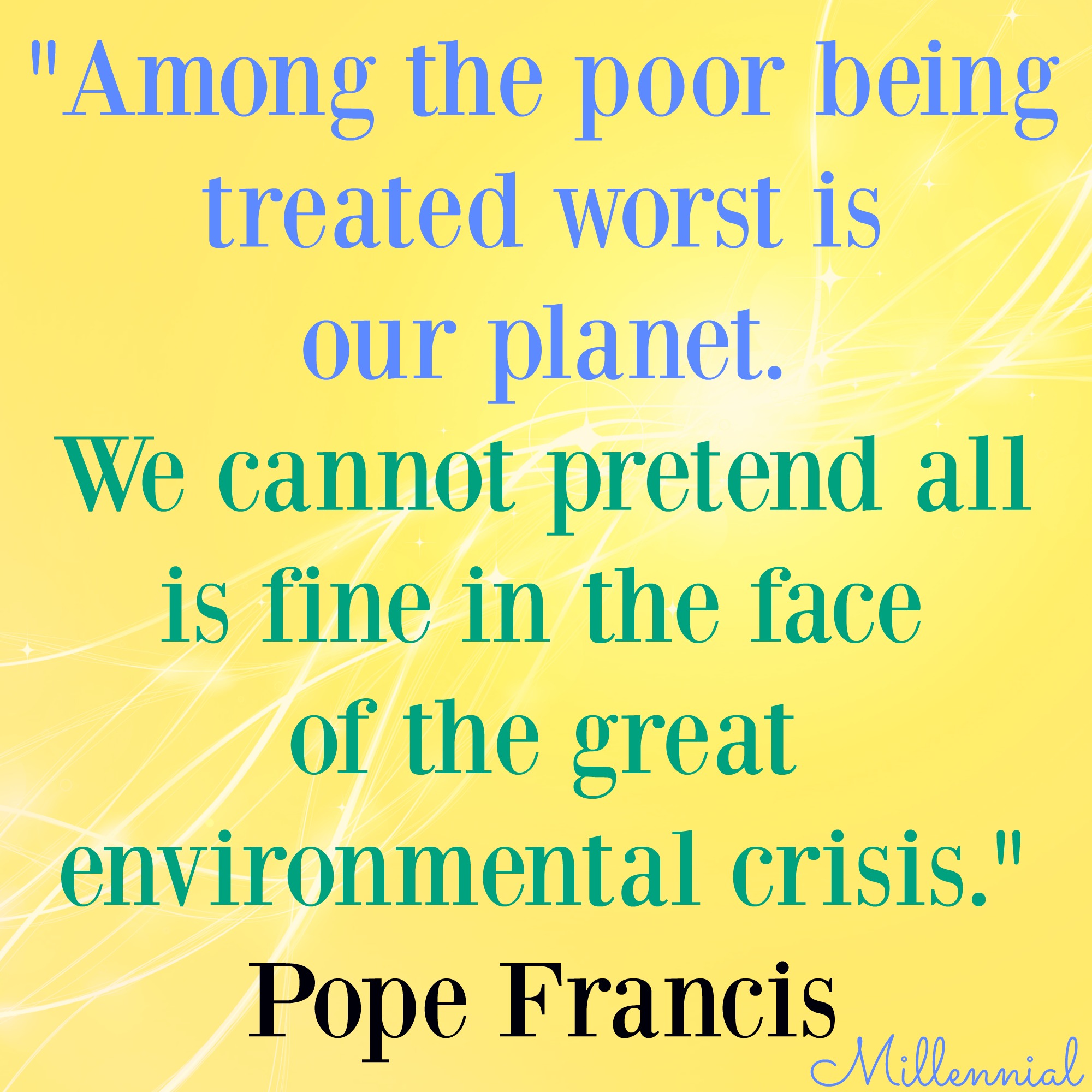 Pope Francis: “Among the poor being treated worst is our planet. We cannot pretend all is fine in the face of the great environmental crisis.”