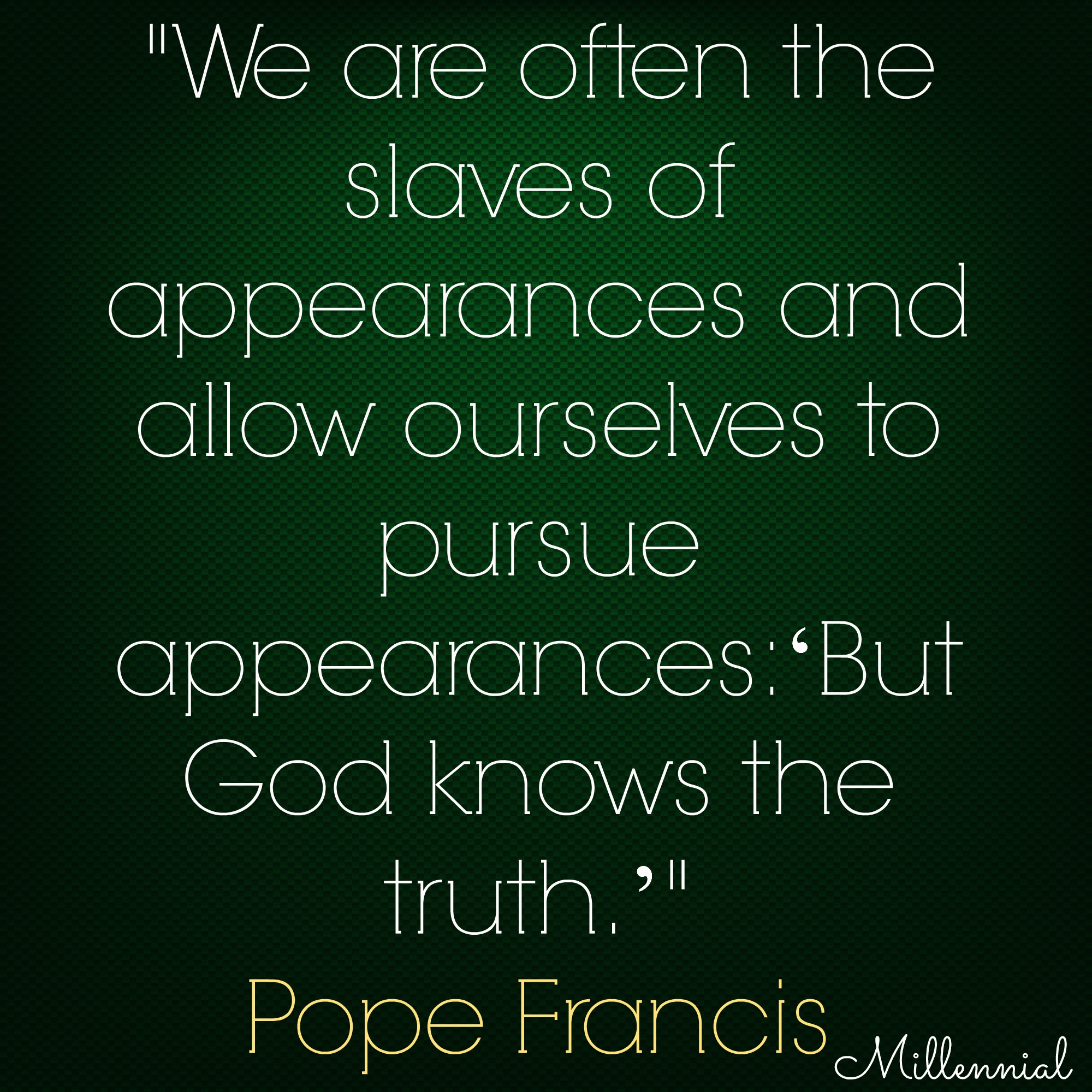 Quote of the Day Pope Francis: “We are often the slaves of appearances and allow ourselves to pursue appearances: ‘But God knows the truth.’” Share this: Share on Facebook (Opens in new window) Facebook Share on LinkedIn (Opens in new window) LinkedIn Share on Threads (Opens in new window) Threads Share on Reddit (Opens in new window) Reddit Share on Tumblr (Opens in new window) Tumblr Share on X (Opens in new window) X Share on Bluesky (Opens in new window) Bluesky Share on Pinterest (Opens in new window) Pinterest Email a link to a friend (Opens in new window) Email Print (Opens in new window) Print Like Loading... Related