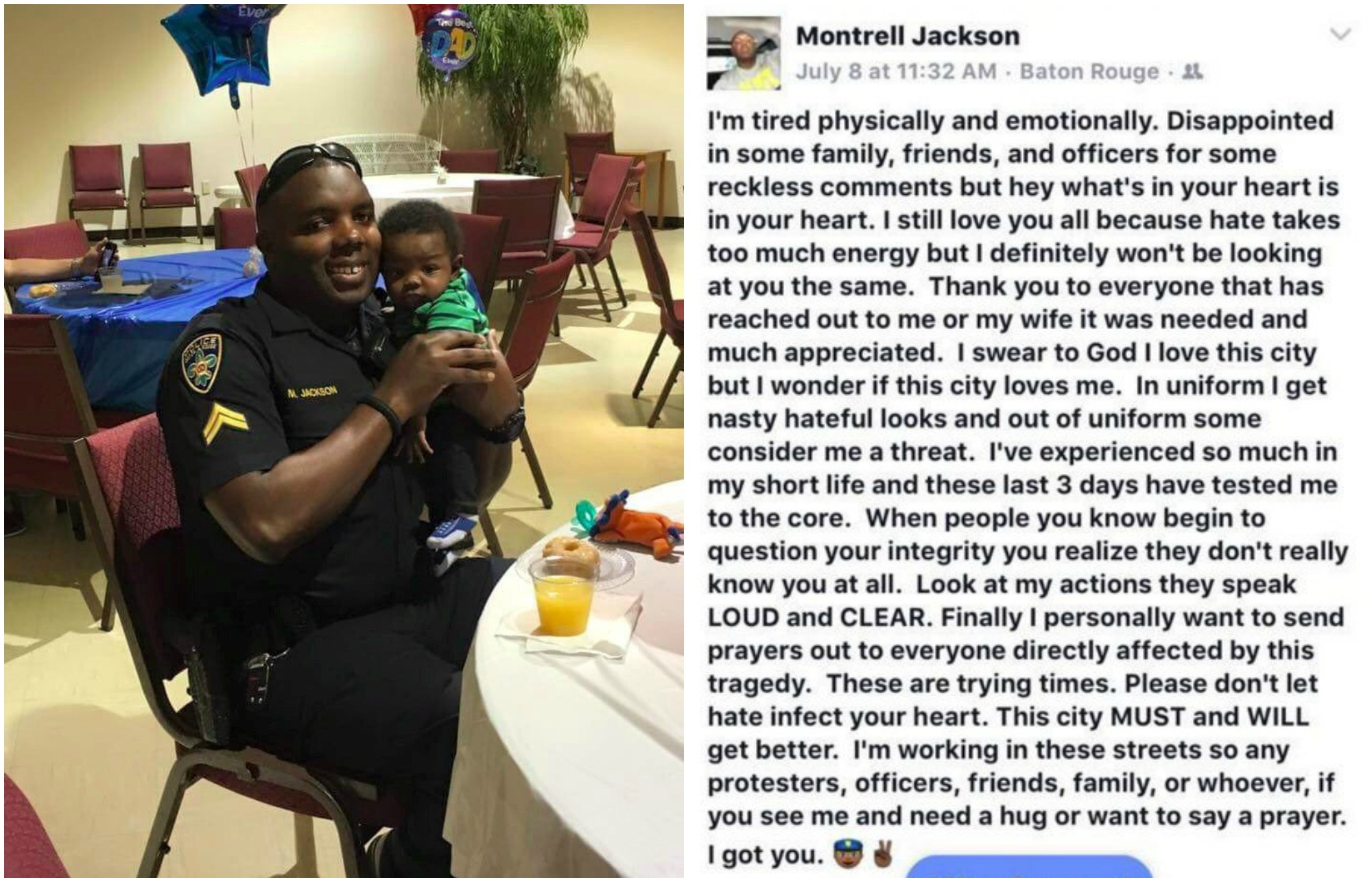 Four days after the police-involved shooting of Alton Sterling turned his city upside down, sending ripple effects nationwide, Baton Rouge, Louisiana, Police officer Montrell Jackson issued a plea to the embattled community and vowed to do his part to help it heal….One week later, on Sunday, Jackson’s life was cut short in a shootout that left three officers dead and three more injured, law enforcement said.