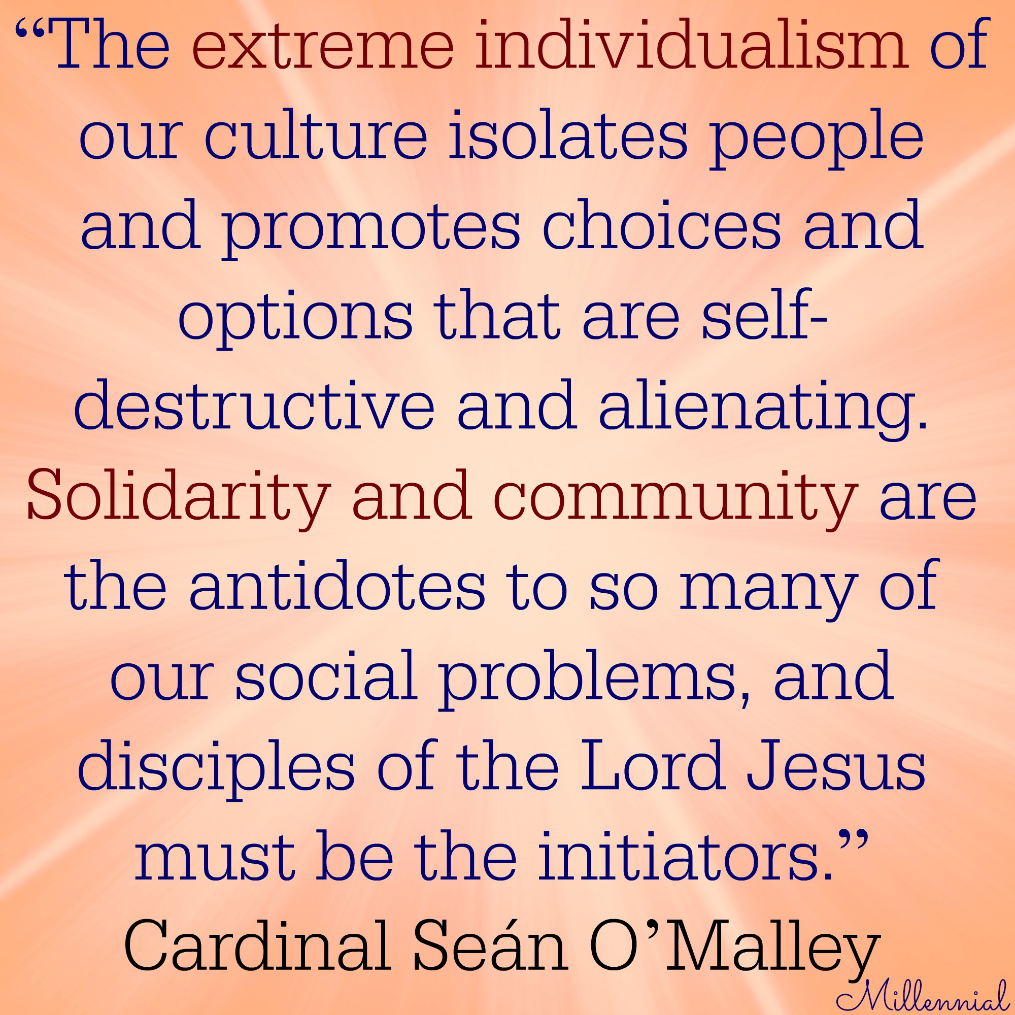 Cardinal Seán O’Malley: “The extreme individualism of our culture isolates people and promotes choices and options that are self-destructive and alienating. Solidarity and community are the antidotes to so many of our social problems, and disciples of the Lord Jesus must be the initiators.”