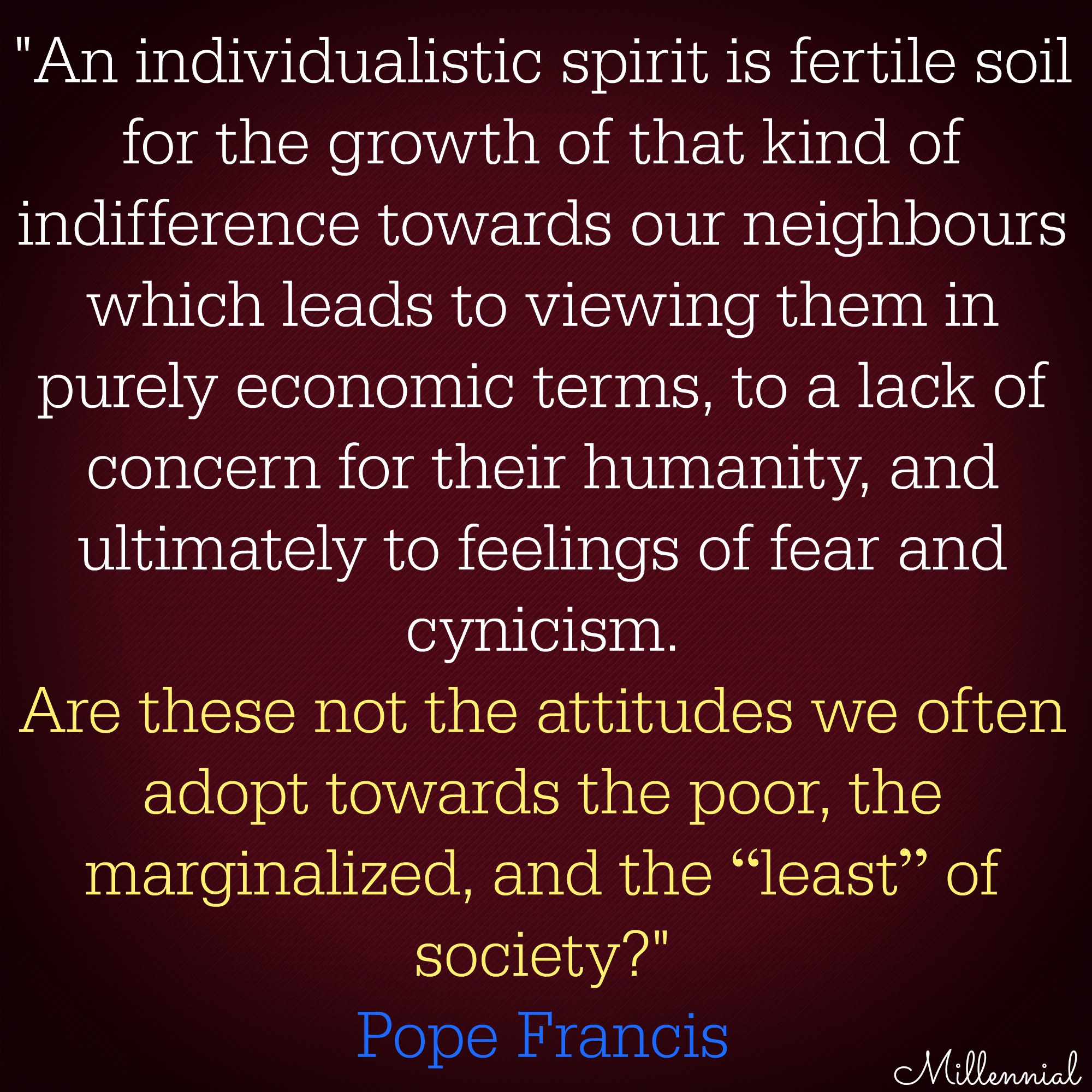 Pope Francis: “An individualistic spirit is fertile soil for the growth of that kind of indifference towards our neighbours which leads to viewing them in purely economic terms, to a lack of concern for their humanity, and ultimately to feelings of fear and cynicism. Are these not the attitudes we often adopt towards the poor, the marginalized, and the “least” of society.”