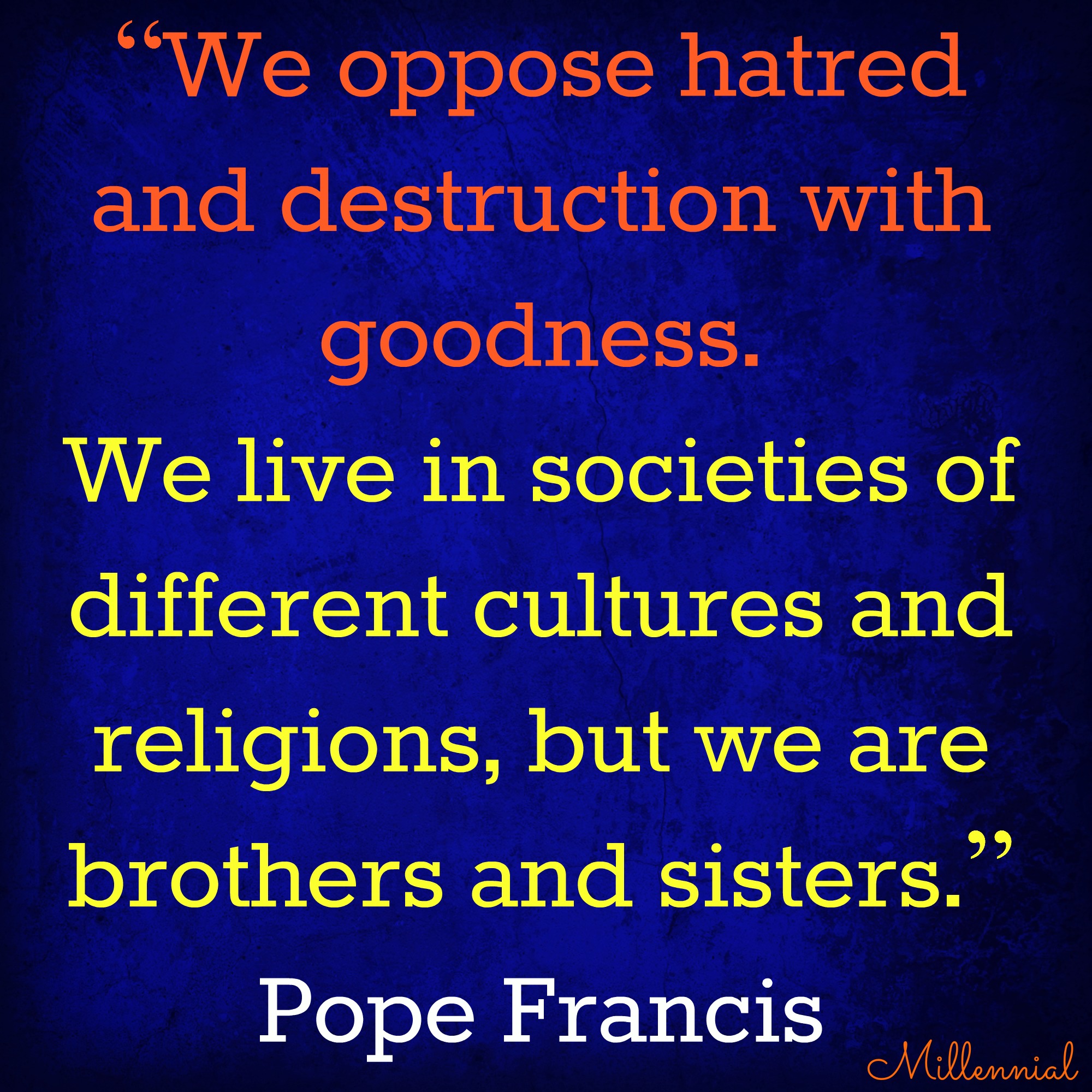 Pope Francis: “We oppose hatred and destruction with goodness. We live in societies of different cultures and religions, but we are brothers and sisters.”