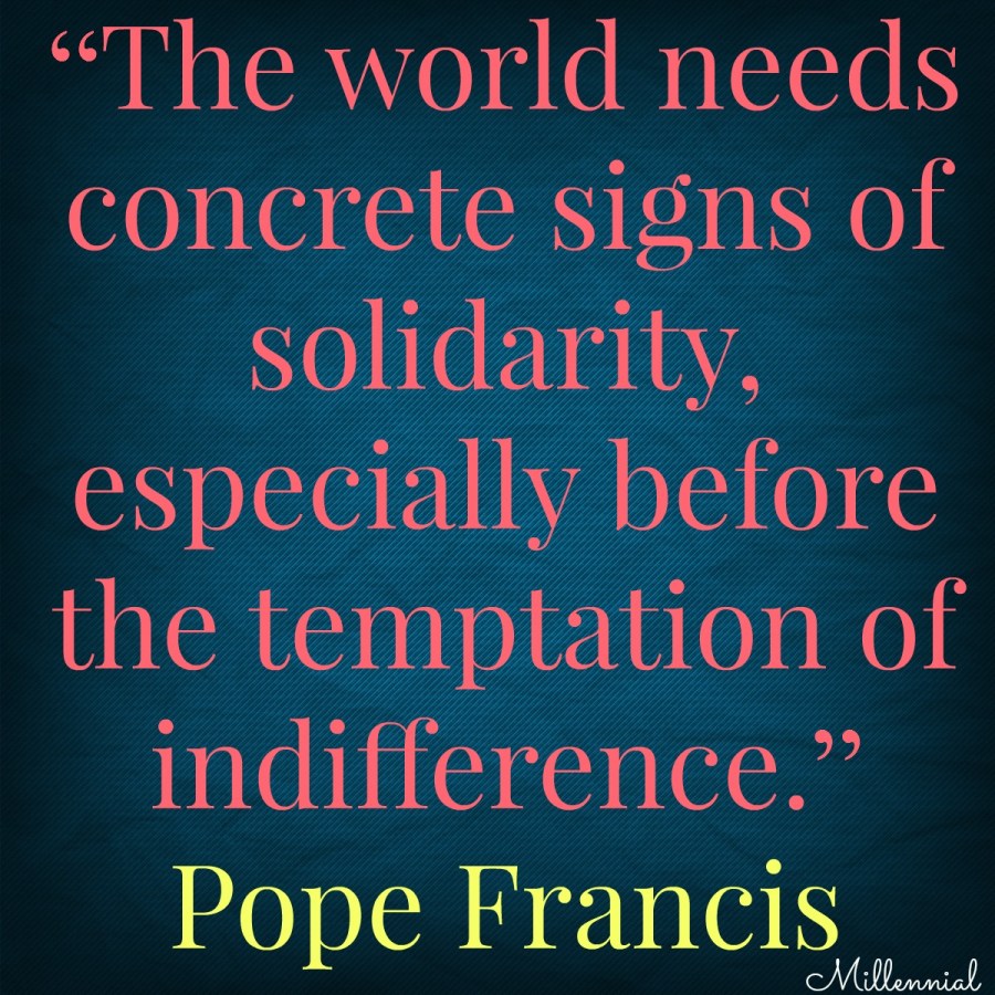 Quote of the Day Pope Francis: “The world needs concrete signs of solidarity, especially before the temptation of indifference.” Share this: Click to share on Facebook (Opens in new window) Facebook Click to share on LinkedIn (Opens in new window) LinkedIn Click to share on Threads (Opens in new window) Threads Click to share on Reddit (Opens in new window) Reddit Click to share on Tumblr (Opens in new window) Tumblr Click to share on X (Opens in new window) X Click to share on Bluesky (Opens in new window) Bluesky Click to share on Pinterest (Opens in new window) Pinterest Click to email a link to a friend (Opens in new window) Email Click to print (Opens in new window) Print Like Loading... Related