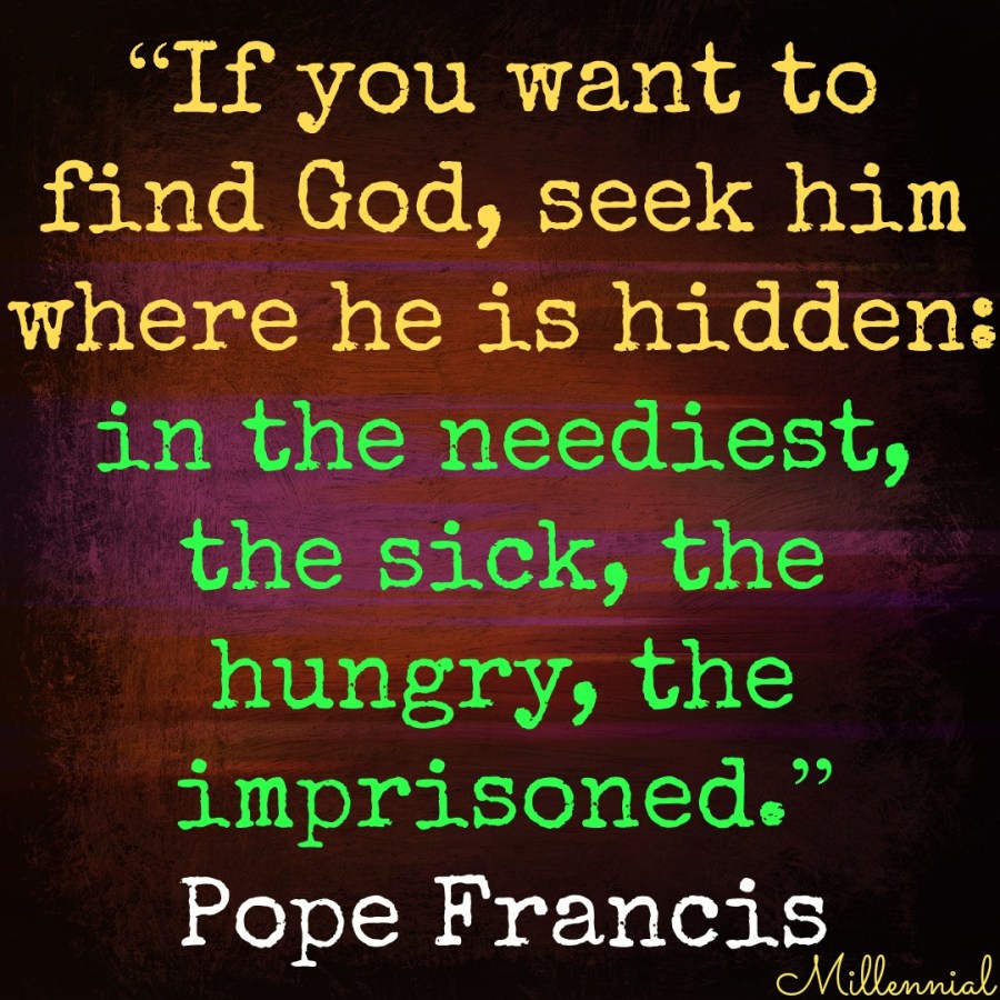 Quote of the Day Pope Francis: “If you want to find God, seek him where he is hidden: in the neediest, the sick, the hungry, the imprisoned.” Share this: Share on Facebook (Opens in new window) Facebook Share on LinkedIn (Opens in new window) LinkedIn Share on Threads (Opens in new window) Threads Share on Reddit (Opens in new window) Reddit Share on Tumblr (Opens in new window) Tumblr Share on X (Opens in new window) X Share on Bluesky (Opens in new window) Bluesky Share on Pinterest (Opens in new window) Pinterest Email a link to a friend (Opens in new window) Email Print (Opens in new window) Print Like Loading... Related
