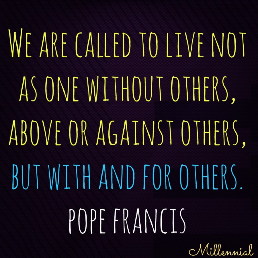 Quote of the Day Pope Francis: “We are called to live not as one without others, above or against others, but with and for others.” Share this: Click to share on Facebook (Opens in new window) Facebook Click to share on LinkedIn (Opens in new window) LinkedIn Click to share on Threads (Opens in new window) Threads Click to share on Reddit (Opens in new window) Reddit Click to share on Tumblr (Opens in new window) Tumblr Click to share on X (Opens in new window) X Click to share on Bluesky (Opens in new window) Bluesky Click to share on Pinterest (Opens in new window) Pinterest Click to email a link to a friend (Opens in new window) Email Click to print (Opens in new window) Print Like Loading... Related