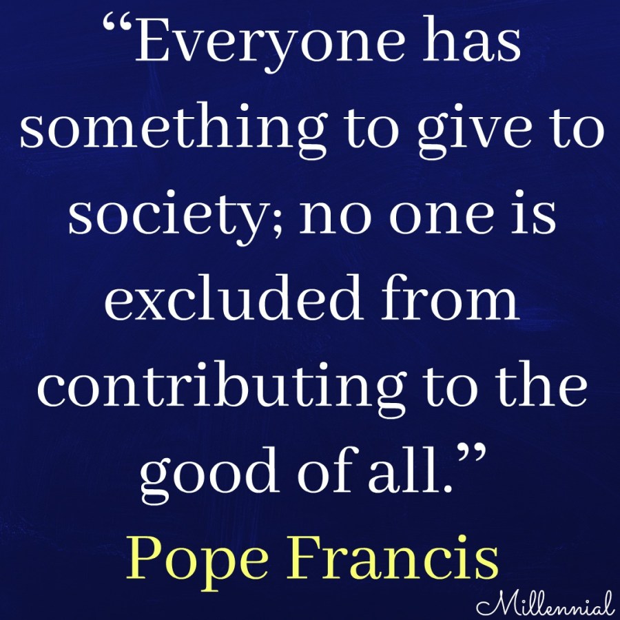 Quote of the Day Pope Francis: “Everyone has something to give to society; no one is excluded from contributing to the good of all.” Share this: Click to share on Facebook (Opens in new window) Facebook Click to share on LinkedIn (Opens in new window) LinkedIn Click to share on Threads (Opens in new window) Threads Click to share on Reddit (Opens in new window) Reddit Click to share on Tumblr (Opens in new window) Tumblr Click to share on X (Opens in new window) X Click to share on Bluesky (Opens in new window) Bluesky Click to share on Pinterest (Opens in new window) Pinterest Click to email a link to a friend (Opens in new window) Email Click to print (Opens in new window) Print Like Loading... Related
