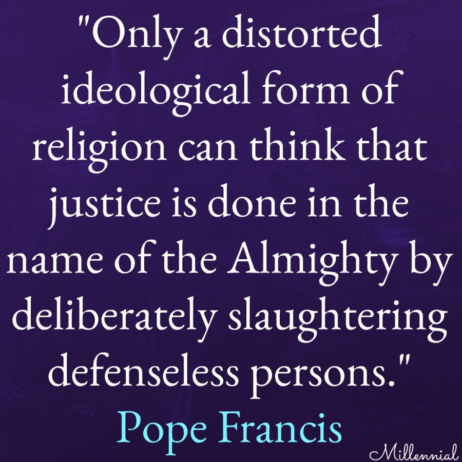 Pope Francis: “Only a distorted ideological form of religion can think that justice is done in the name of the Almighty by deliberately slaughtering defenseless persons.”