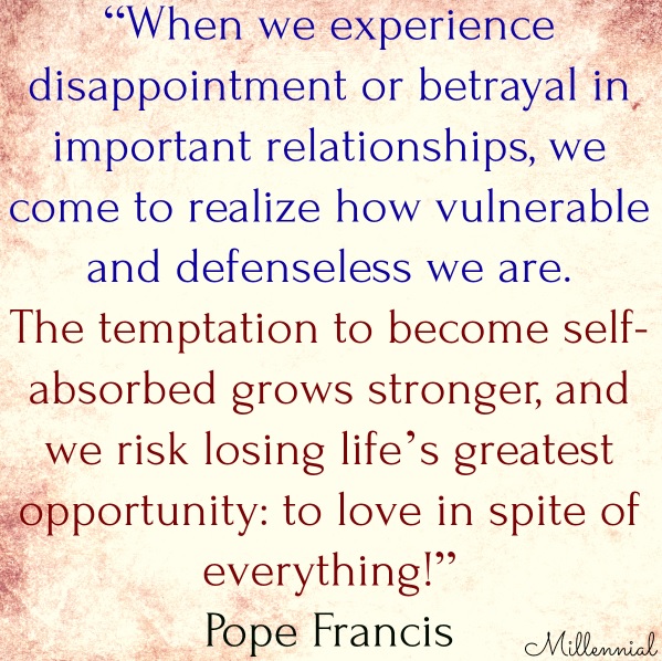 Pope Francis: “When we experience disappointment or betrayal in important relationships, we come to realize how vulnerable and defenseless we are. The temptation to become self-absorbed grows stronger, and we risk losing life’s greatest opportunity: to love in spite of everything!”