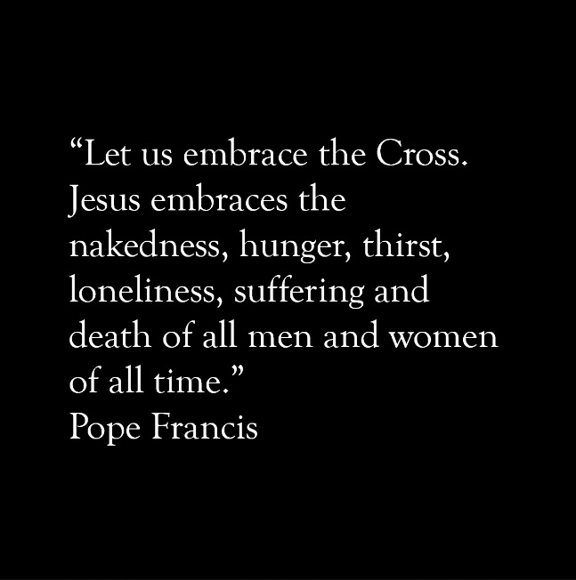 Pope Francis: “Let us embrace the Cross. Jesus embraces the nakedness, hunger, thirst, loneliness, suffering and death of all men and women of all time.”