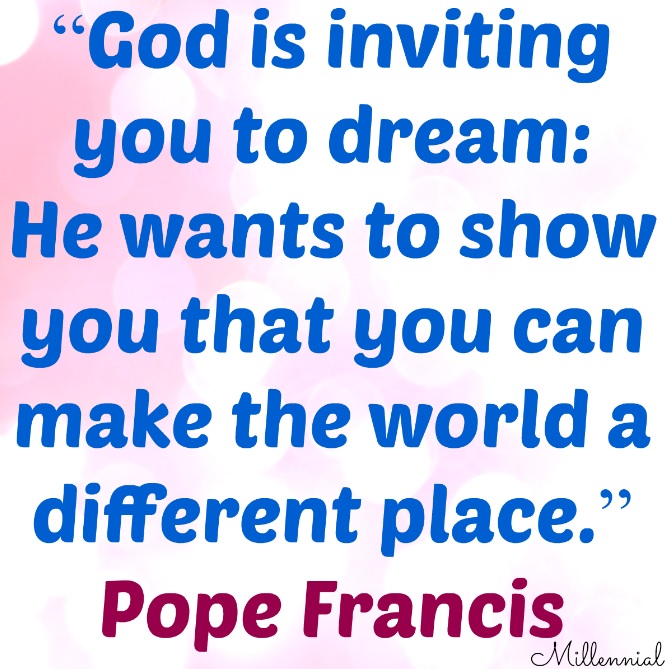 Quote of the Day Pope Francis: “God is inviting you to dream: He wants to show you that you can make the world a different place.” Share this: Share on Facebook (Opens in new window) Facebook Share on LinkedIn (Opens in new window) LinkedIn Share on Threads (Opens in new window) Threads Share on Reddit (Opens in new window) Reddit Share on Tumblr (Opens in new window) Tumblr Share on X (Opens in new window) X Share on Bluesky (Opens in new window) Bluesky Share on Pinterest (Opens in new window) Pinterest Email a link to a friend (Opens in new window) Email Print (Opens in new window) Print Like Loading... Related