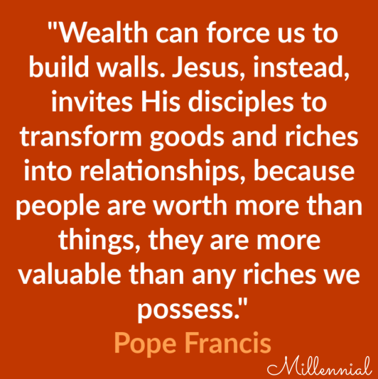 Pope Francis: “Wealth can force us to build walls. Jesus, instead, invites His disciples to transform goods and riches into relationships, because people are worth more than things, they are more valuable than any riches we possess.”