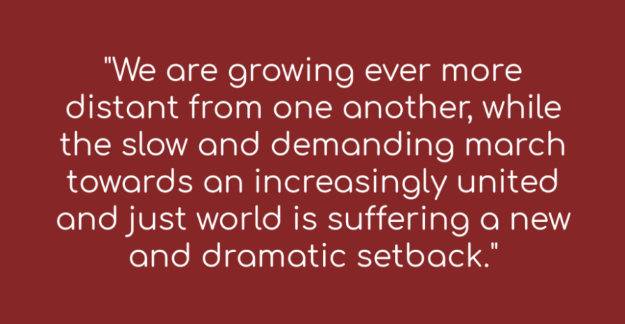 - We are growing ever more distant from one another, while the slow and demanding march towards an increasingly united and just world is suffering a new and dramatic setback. (16)