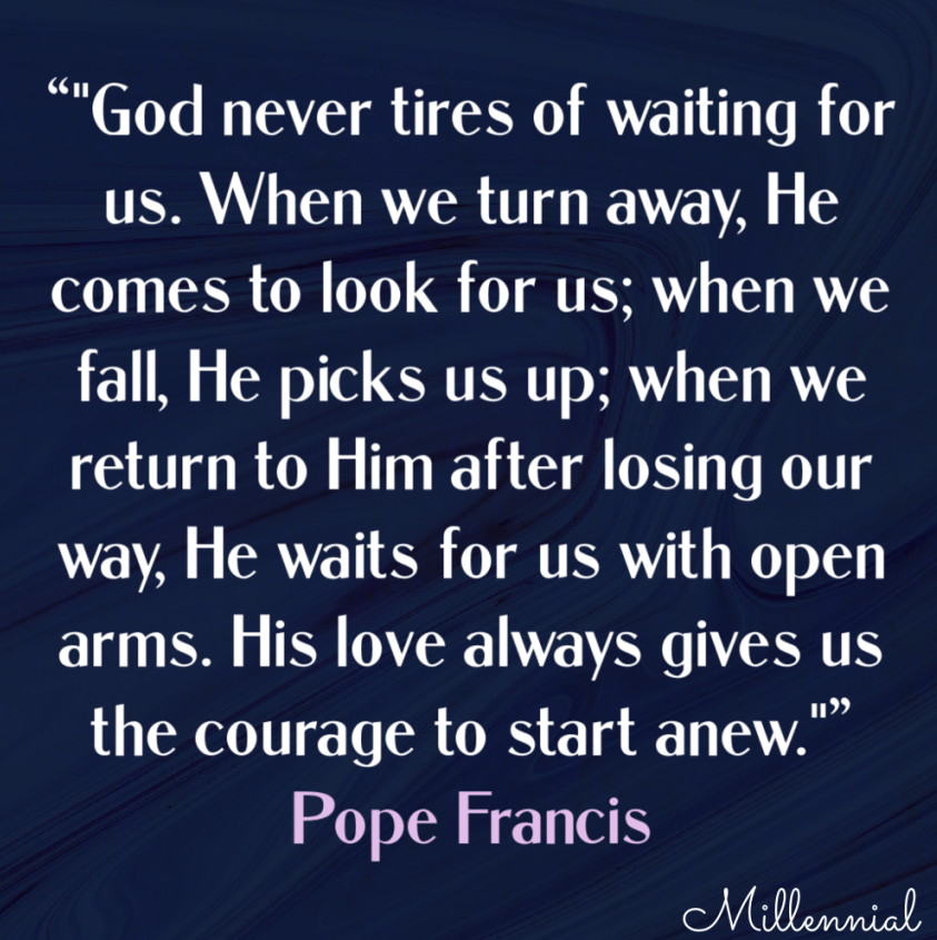 Pope Francis: “God never tires of waiting for us. When we turn away, He comes to look for us; when we fall, He picks us up; when we return to Him after losing our way, He waits for us with open arms. His love always gives us the courage to start anew.”
