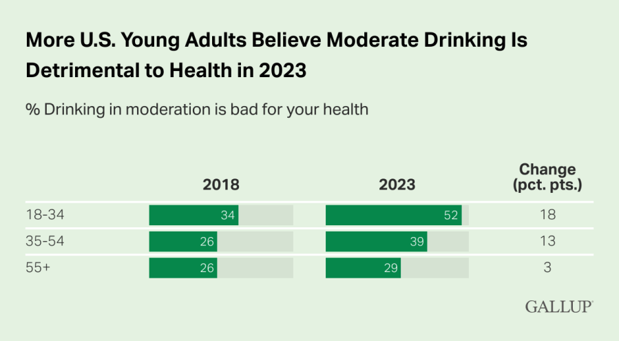 The increased belief that moderate alcohol consumption is detrimental is owed largely to young adults aged 18-34, among whom it has risen 18 points since 2018. That compares with a 13-point increase among middle-aged adults and virtually no change among those 55 and older….