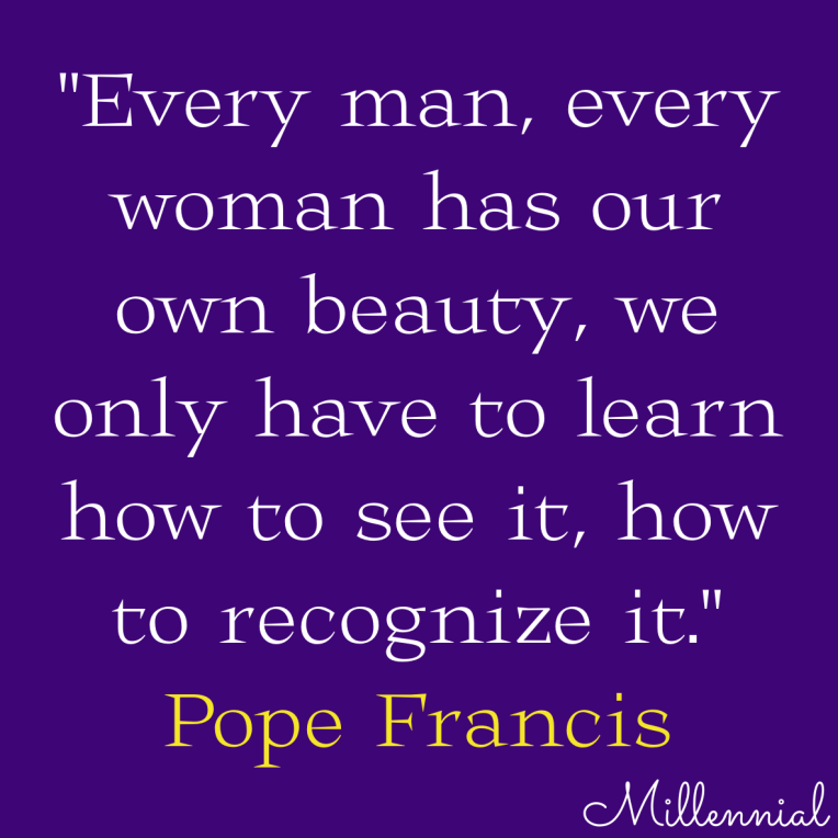 Quote of the Day Pope Francis: “Every man, every woman, has our own beauty, we only have to learn how to see it, how to recognize it.” Share this: Click to share on Facebook (Opens in new window) Facebook Click to share on LinkedIn (Opens in new window) LinkedIn Click to share on Threads (Opens in new window) Threads Click to share on Reddit (Opens in new window) Reddit Click to share on Tumblr (Opens in new window) Tumblr Click to share on X (Opens in new window) X Click to share on Bluesky (Opens in new window) Bluesky Click to share on Pinterest (Opens in new window) Pinterest Click to email a link to a friend (Opens in new window) Email Click to print (Opens in new window) Print Like Loading... Related