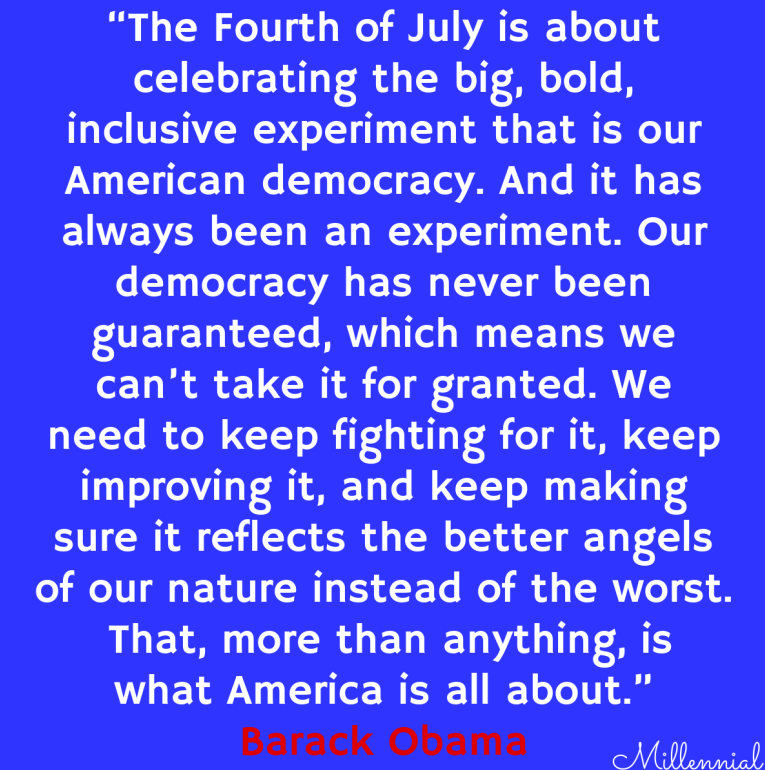 Barack Obama: “The Fourth of July is about celebrating the big, bold, inclusive experiment that is our American democracy. And it has always been an experiment. Our democracy has never been guaranteed, which means we can’t take it for granted. We need to keep fighting for it, keep improving it, and keep making sure it reflects the better angels of our nature instead of the worst. That, more than anything, is what America is all about.”