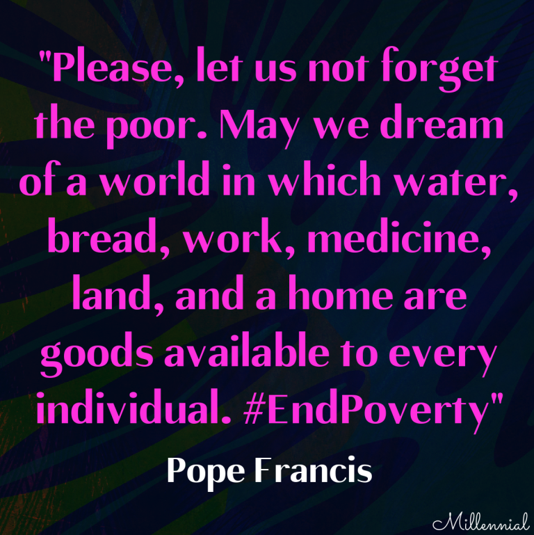 Pope Francis: “Please, let us not forget the poor. May we dream of a world in which water, bread, work, medicine, land, and a home are goods available to every individual. #EndPoverty”